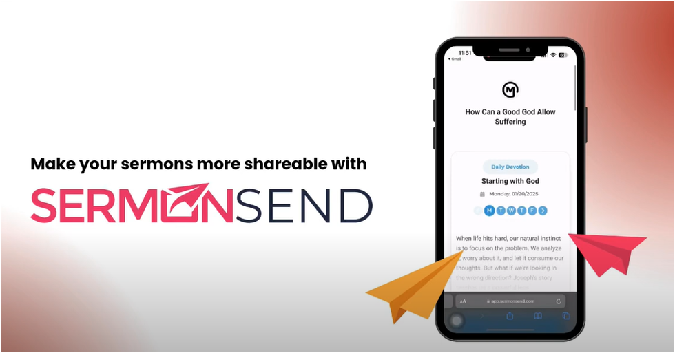 Sermon Send helps you create a single, organized page that contains all your sermon content in one place. It makes it easy for your congregation to engage with your sermon throughout the week through various formats like video clips, devotionals, and blog posts.